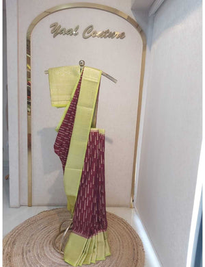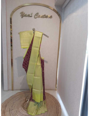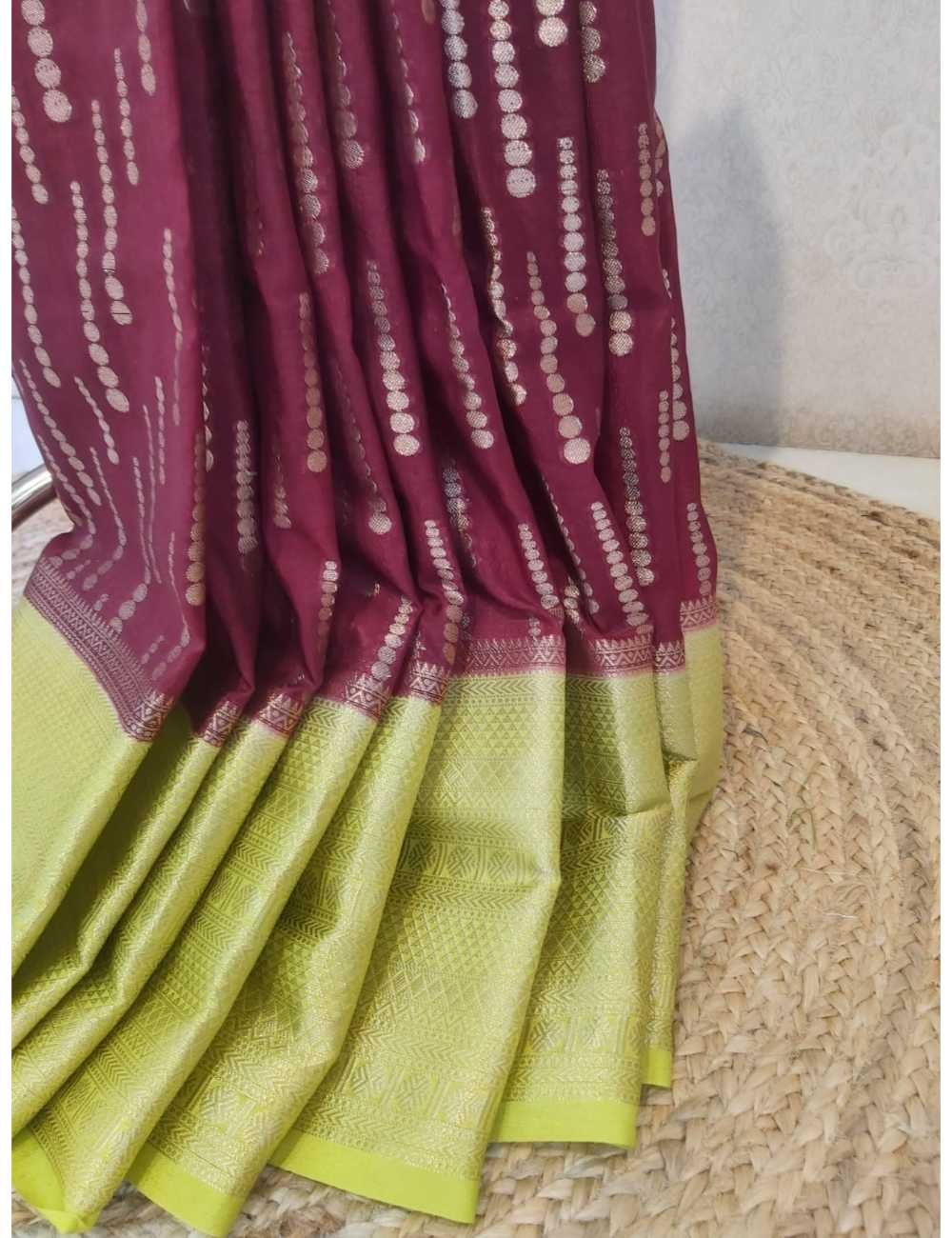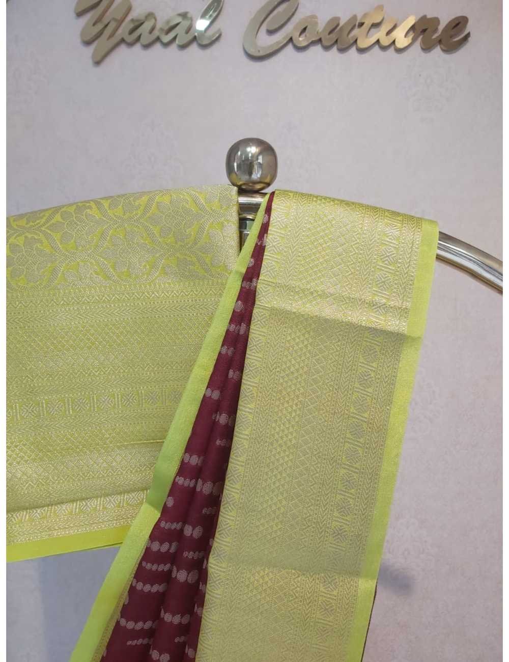 Colour : This Saree has a maroon body with a lime green border and a grand pallu.