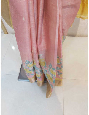 Peach Tassar Hand Block Print with Yellow Border
