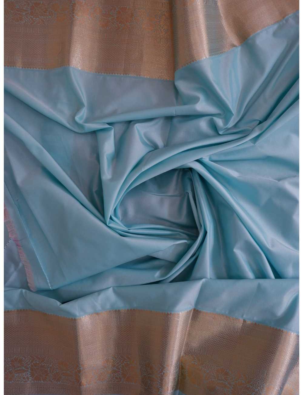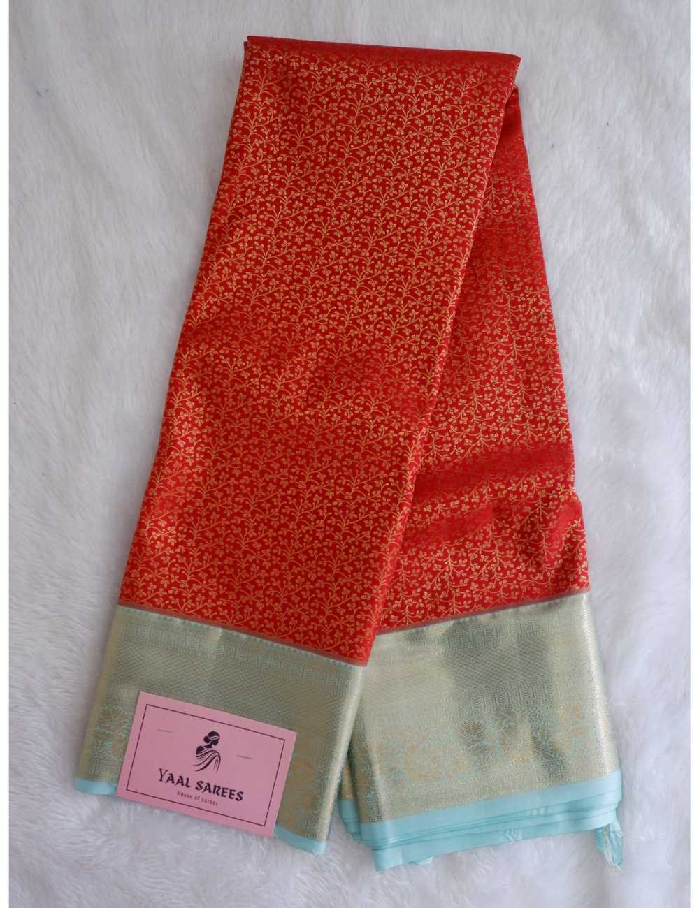 Colour : This Saree has a red body with a mint blue boarder and a grand pallu.