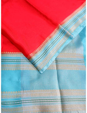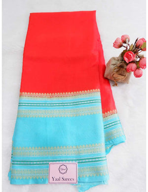 Colour : This saree features a plain red body paired with a sea green Gadwal border and a grand pallu..