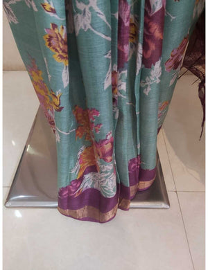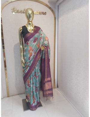 Colour : This Saree has a teal green body with hand block print and purple zari border.