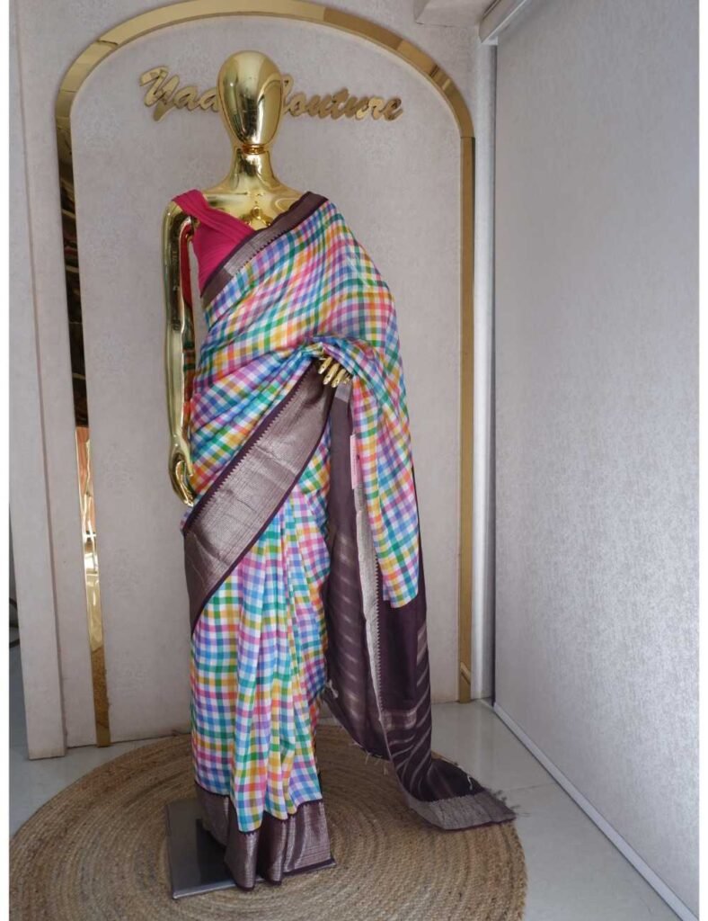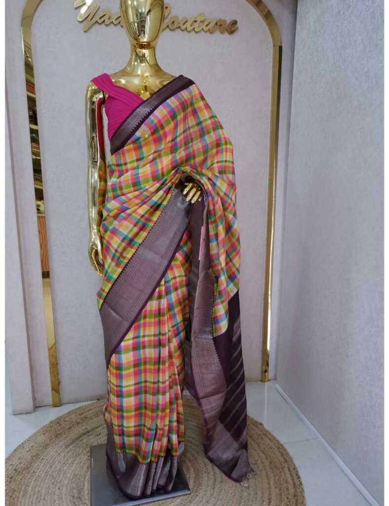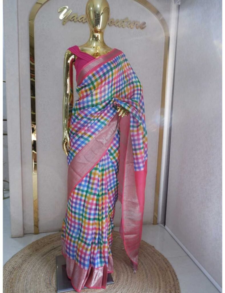 Crape Checks Saree with Motifs Pink And Light Green Border