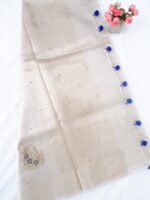 Grace meets elegance in this beige and royal blue tissue saree, beautifully adorned with intricate hand embroidery. Lightweight and luminous, it’s perfect for festive occasions or timeless celebrations.