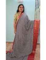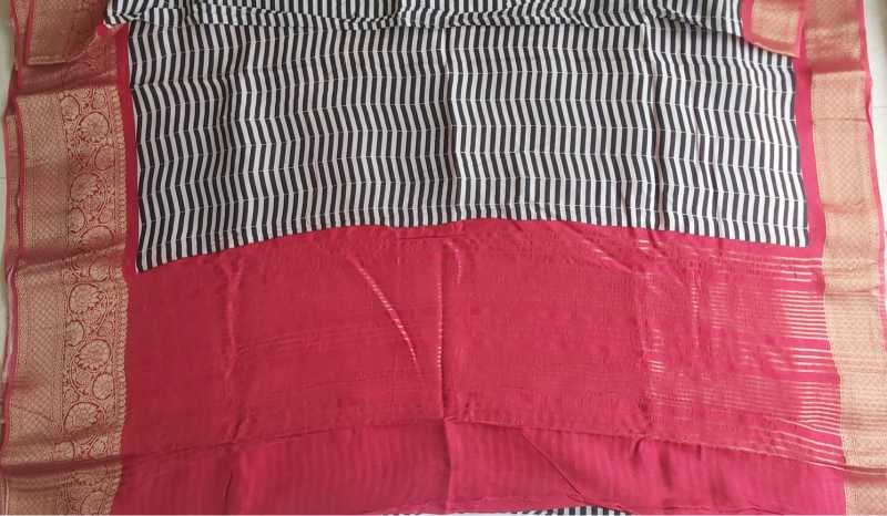 Colour : It Is a Dola silk saree with red border. The body has black and white stripes throughout and has a grand pallu.