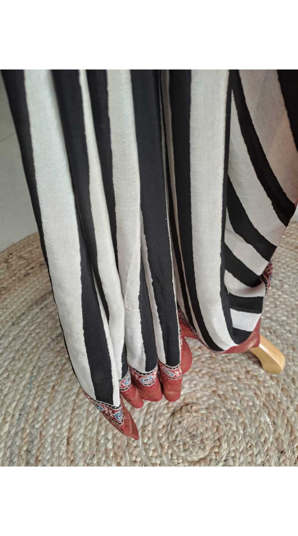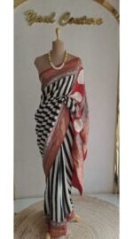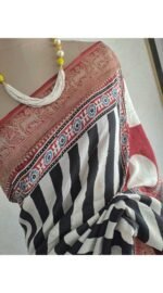 Colour : It Is a Dola silk saree with red gold zari border. The body has black and cream stripes throughout and has a grand pallu.