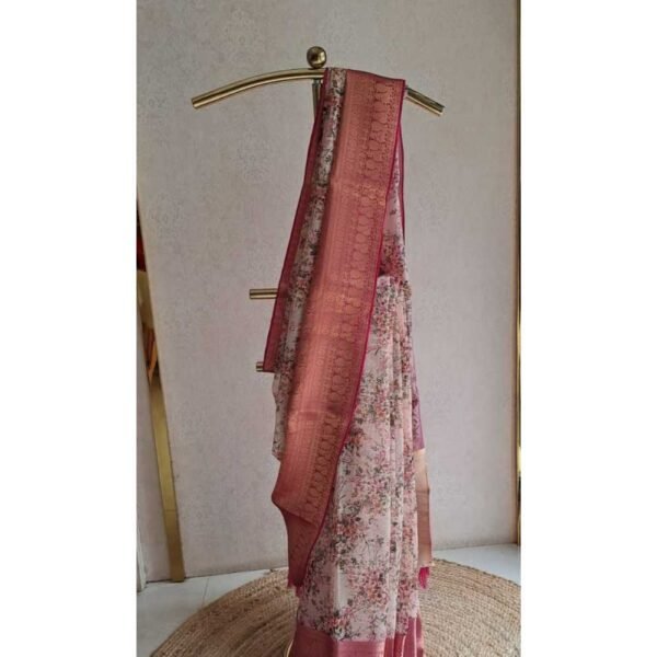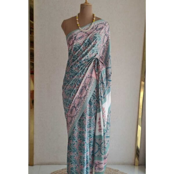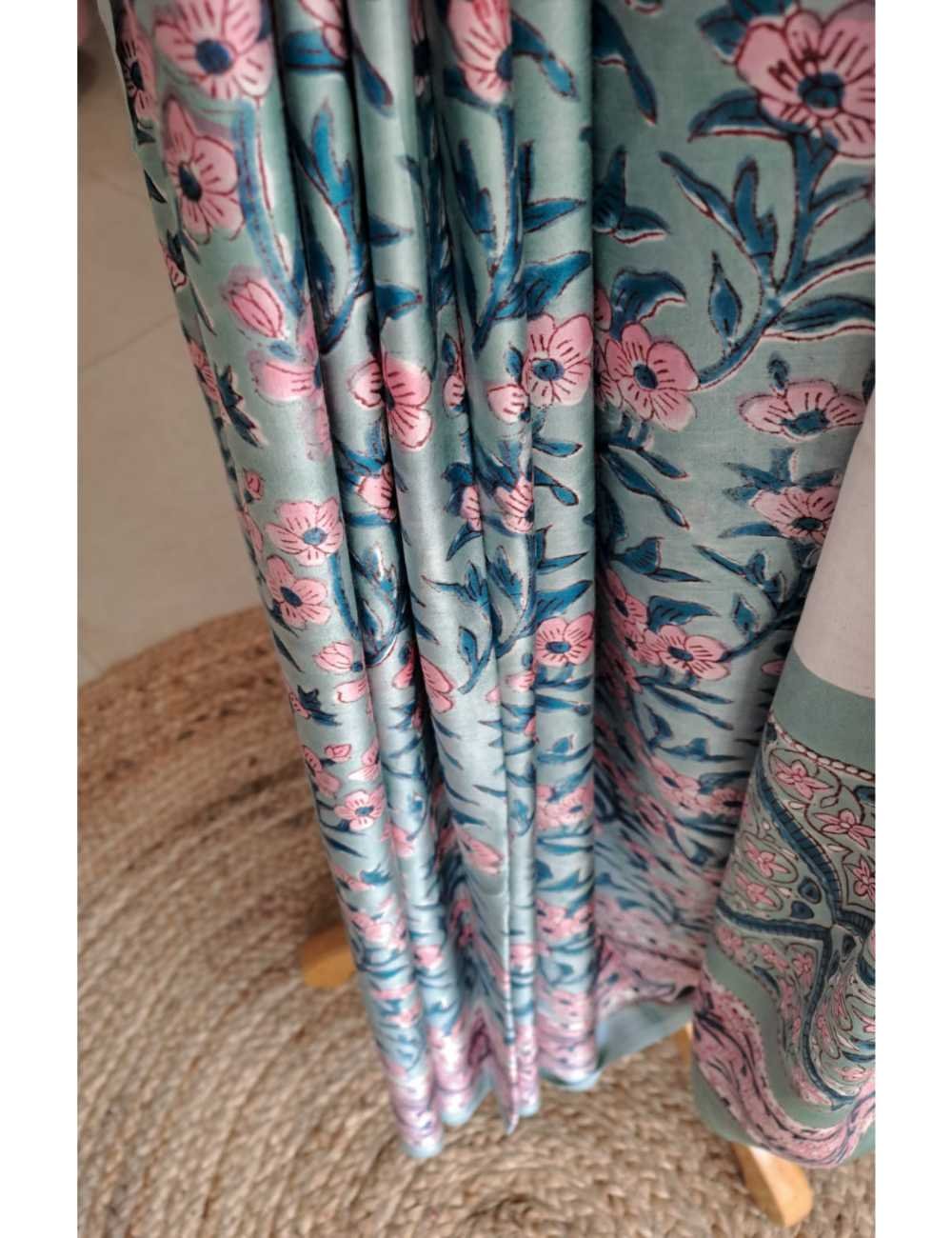 Colour : This Saree has a light sea green body with a light pink ajrakh printed boarder with grand pallu.