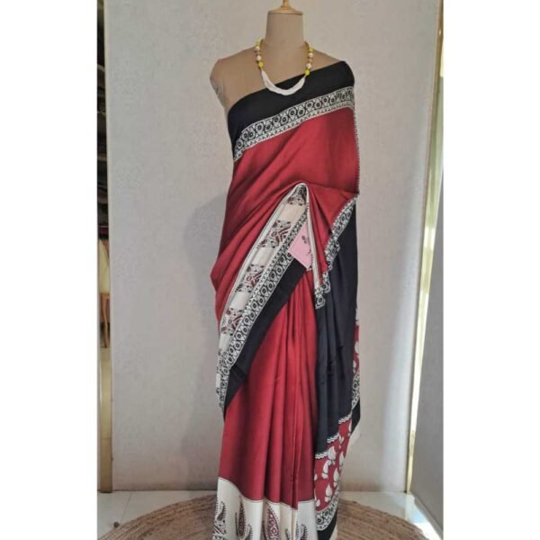 Colour : This Saree has a maroon body with a black boarder and grand pallu.