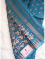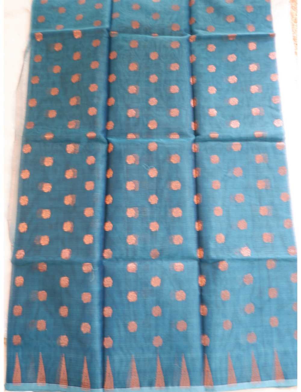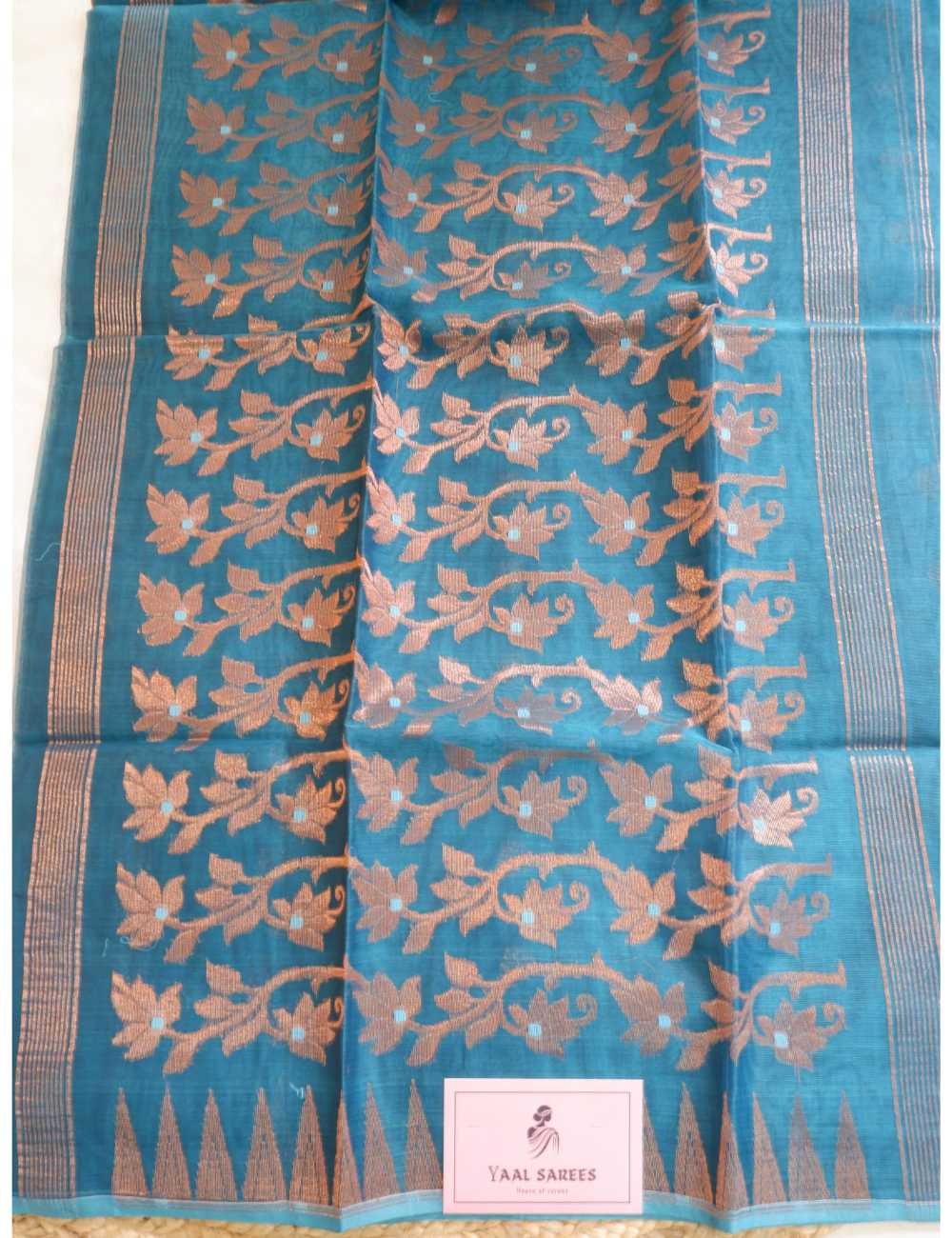 Elevate your ethnic style with this Teal Green Muslin Jamdhani Saree, adorned with intricate copper floral zari weaving and dotted motifs. Lightweight and graceful, perfect for festive or elegant daytime occasions.
